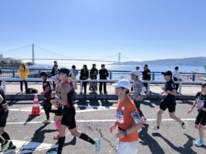 写真は大蔵海岸付近で明石海峡大橋の絶景を背景に走るランナー。